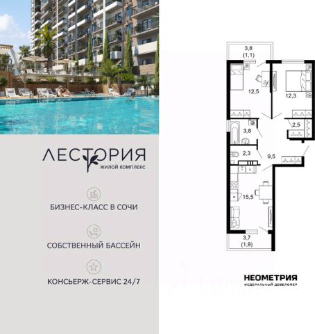 Продается квартира в жилом комплексе бизнес-класса "Лестория". В составе ЖК предусмотрена собственная аквазона площадью 473 квадратных метра с двумя подогреваемыми бассейнами, что соответствуют стандартам бизнес-класса. Аквазона объединяет взрослый и детский бассейны. В welcome-zone к услугам посетителей шезлонги и все необходимые принадлежности. Раздевалки с душевыми комнатами, инфракрасная сауна — здесь все предусмотрено для комфортного отдыха и полного расслабления. Для водного комплекса продуман отдельный вход, оборудованный системой контроля и управления доступом (СКУД). Аквазона только часть уникальной инфраструктуры "Лестории", которая включает в себя также благоустроенную территорию с пятьюдесятью функциональными зонами для прогулок, отдыха и занятий спортом, видовые террасы на крышах для отдыха, работы и встреч с друзьями, а также пространство набережной Кудепсты с шезлонгами и перголами. Жилой комплекс "Лестория" состоит из шести домов высотностью от 15 до 17 этажей, окружённых зеленым массивом национального парка. На придомовой территории для жителей предусмотрены закрытые дворы с круглосуточным видеонаблюдением, активити-центр для детей и подростков, тихие зоны для отдыха и медитации. На крышах домов будут созданы зеленые террасы для наслаждения прекрасными видами на море и горы. В проекте предусмотрены разные варианты отделки квартир под потребности покупателей. Тем, кто хочет воплотить в жизнь собственные интерьерные задумки, подойдут квартиры без ремонта. Для комфортной жизни и отдыха в комплексе будет работать круглосуточный консьерж-сервис уровня 5*, который с легкостью закроет все ежедневные потребности: от заказа продуктов и встречи гостей в аэропорту до выгула и дрессировки питомца. К услугам жителей ЖК "Лестория" — собственная управляющая компания, для инвесторов предоставляются услуги доверительного управления.