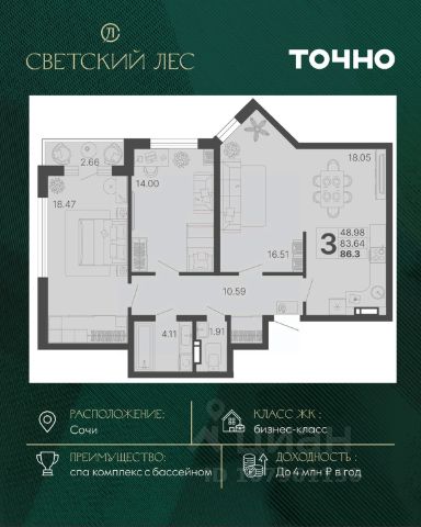 Видовые квартиры с окнами на три стороны света и семейные форматы с тремя спальнями, двумя ванными и отдельной кухней;