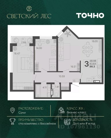 Жилой комплекс состоит из 7 домов переменной этажности от 11 до 20 этажей. В холлах и вестибюлях выполнена дизайнерская отделка, установлены скоростные лифты. На 1 этажах расположены зоны ожидания и колясочные. В проекте предложено множество планировочных решений: в наличии квартиры классического типа. Сдаются они с подчистовой отделкой, панорамными окнами и высотой потолков в 3м. Некоторые квартиры имеют вид на лесной массив и горы. На закрытой территории комплекса выполнен ландшафтный дизайн, установлены безопасные детские площадки для детей всех возрастов, места для отдыха, зоны барбекю с беседками, спортивные площадки, установлен открытый бассейн. На территории также оборудована своя набережная протяженностью в 1,2км. Для владельцев автомобилей предусмотрен отдельный многоуровневый паркинг. Жилой комплекс располагается в активно развивающемся Хостинском районе. В нескольких минутах ходьбы находятся поликлиники, школы, детские сады, кинотеатр, магазины и кафе. До центра Сочи можно добраться за 30 минут транспортом.