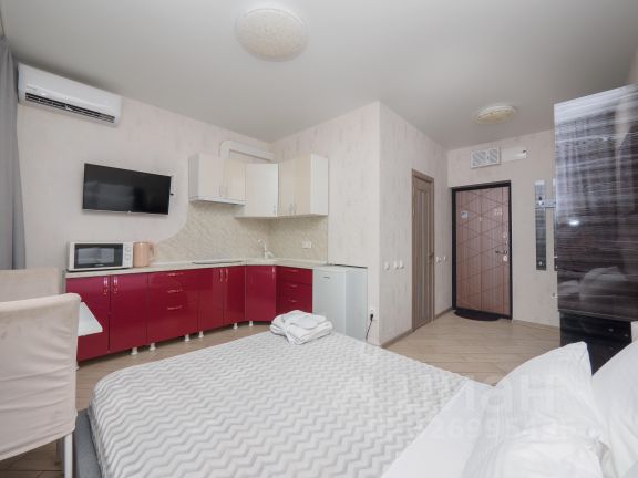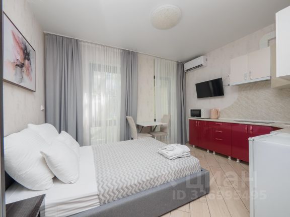 Студия не сдавалась гостям с животными, не для проведения вечеринок, курение в квартире запрещалось. Имеется все для постоянного и круглогодичного проживания. В апартаментах остается всё - ничего докупать не нужно. Отдельный санузел, кухонная зона, балкон с ротанговой мебелью в окружении реликтовых хвойных деревьев. Теплый пол во всей квартире, в том числе санузле. Кондиционер, двуспальная кровать с ортопедическим матрацем, полотенца и постельные принадлежности, раскладывающийся комфортный диван с нишей для хранения, интернет (оплачен до июля 2026 г.). Весь комплекс окружен реликтовыми хвойными деревьями. Во дворе комплекса есть бассейн и детская площадка.
