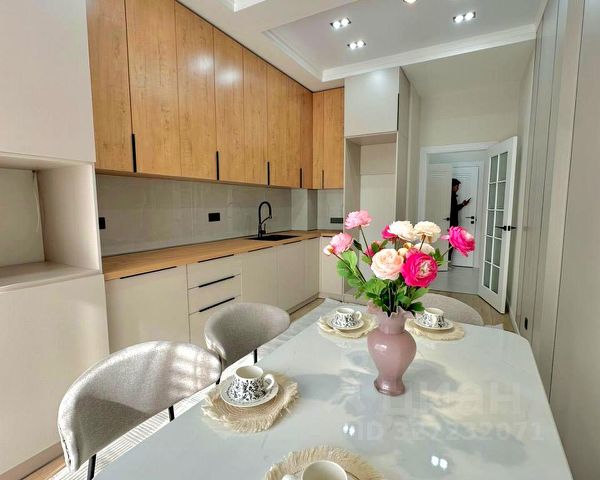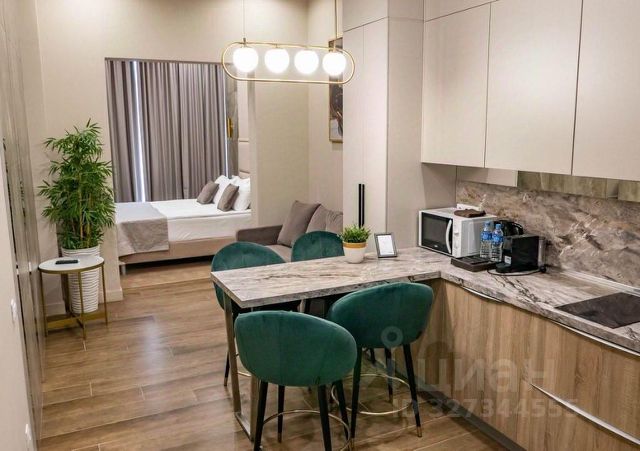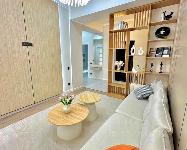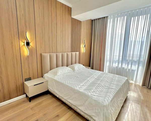 В квартире выполнен современный ремонт, остаются мебель и техника. Благодаря панорамным окнам в помещение проникает много света.