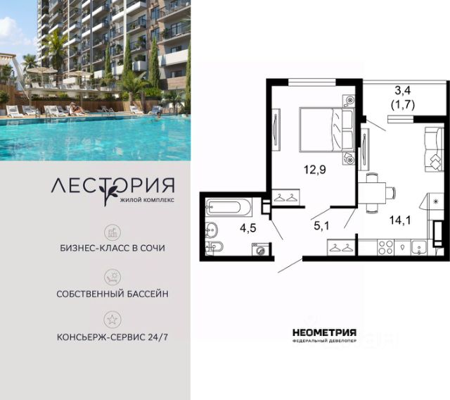 Продается квартира в жилом комплексе бизнес-класса "Лестория". В составе ЖК предусмотрена собственная аквазона площадью 473 квадратных метра с двумя подогреваемыми бассейнами, что соответствуют стандартам бизнес-класса. Аквазона объединяет взрослый и детский бассейны. В welcome-zone к услугам посетителей шезлонги и все необходимые принадлежности. Раздевалки с душевыми комнатами, инфракрасная сауна — здесь все предусмотрено для комфортного отдыха и полного расслабления. Для водного комплекса продуман отдельный вход, оборудованный системой контроля и управления доступом (СКУД). Аквазона только часть уникальной инфраструктуры "Лестории", которая включает в себя также благоустроенную территорию с пятьюдесятью функциональными зонами для прогулок, отдыха и занятий спортом, видовые террасы на крышах для отдыха, работы и встреч с друзьями, а также пространство набережной Кудепсты с шезлонгами и перголами. Жилой комплекс "Лестория" состоит из шести домов высотностью от 15 до 17 этажей, окружённых зеленым массивом национального парка. На придомовой территории для жителей предусмотрены закрытые дворы с круглосуточным видеонаблюдением, активити-центр для детей и подростков, тихие зоны для отдыха и медитации. На крышах домов будут созданы зеленые террасы для наслаждения прекрасными видами на море и горы. В проекте предусмотрены разные варианты отделки квартир под потребности покупателей. Тем, кто хочет воплотить в жизнь собственные интерьерные задумки, подойдут квартиры без ремонта. Для комфортной жизни и отдыха в комплексе будет работать круглосуточный консьерж-сервис уровня 5*, который с легкостью закроет все ежедневные потребности: от заказа продуктов и встречи гостей в аэропорту до выгула и дрессировки питомца. К услугам жителей ЖК "Лестория" — собственная управляющая компания, для инвесторов предоставляются услуги доверительного управления. #z6fB75