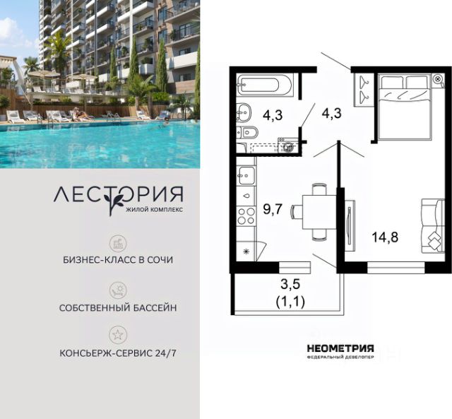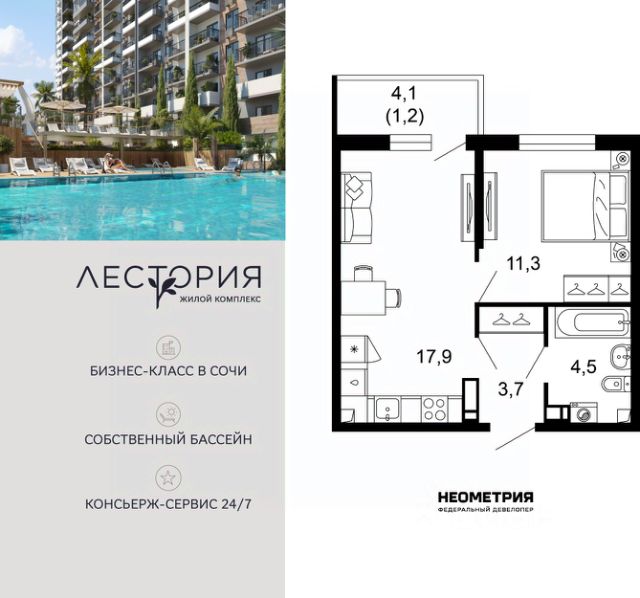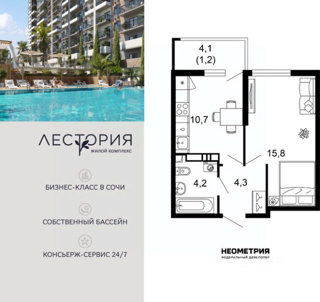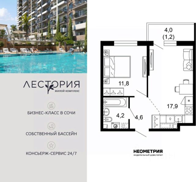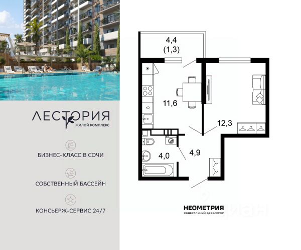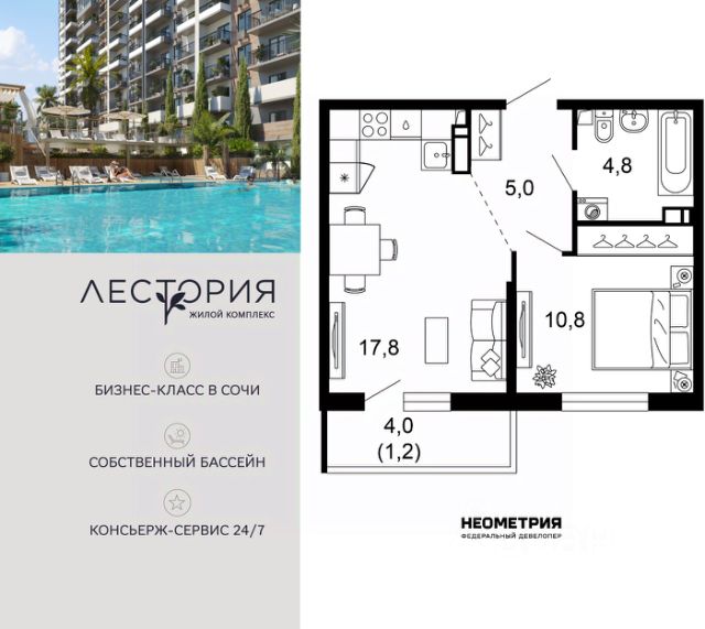 Продается квартира в жилом комплексе бизнес-класса "Лестория". В составе ЖК предусмотрена собственная аквазона площадью 473 квадратных метра с двумя подогреваемыми бассейнами, что соответствуют стандартам бизнес-класса. Аквазона объединяет взрослый и детский бассейны. В welcome-zone к услугам посетителей шезлонги и все необходимые принадлежности. Раздевалки с душевыми комнатами, инфракрасная сауна — здесь все предусмотрено для комфортного отдыха и полного расслабления. Для водного комплекса продуман отдельный вход, оборудованный системой контроля и управления доступом (СКУД). Аквазона только часть уникальной инфраструктуры "Лестории", которая включает в себя также благоустроенную территорию с пятьюдесятью функциональными зонами для прогулок, отдыха и занятий спортом, видовые террасы на крышах для отдыха, работы и встреч с друзьями, а также пространство набережной Кудепсты с шезлонгами и перголами. Жилой комплекс "Лестория" состоит из шести домов высотностью от 15 до 17 этажей, окружённых зеленым массивом национального парка. На придомовой территории для жителей предусмотрены закрытые дворы с круглосуточным видеонаблюдением, активити-центр для детей и подростков, тихие зоны для отдыха и медитации. На крышах домов будут созданы зеленые террасы для наслаждения прекрасными видами на море и горы. В проекте предусмотрены разные варианты отделки квартир под потребности покупателей. Тем, кто хочет воплотить в жизнь собственные интерьерные задумки, подойдут квартиры без ремонта. Для комфортной жизни и отдыха в комплексе будет работать круглосуточный консьерж-сервис уровня 5*, который с легкостью закроет все ежедневные потребности: от заказа продуктов и встречи гостей в аэропорту до выгула и дрессировки питомца. К услугам жителей ЖК "Лестория" — собственная управляющая компания, для инвесторов предоставляются услуги доверительного управления. #zmFBt7