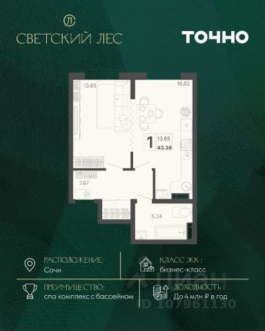 ЖК "Светский лес" — эксклюзивный жилой проект бизнес-класса в Сочи. Это остров цивилизации и технологий в окружении дикой природы национального парка с богатой инфраструктурой, наполненной различными сценариями премиального отдыха и жизни. Общественное пространство жилого комплекса включает в себя прогулочные зоны, спа-комплекс с круглогодичным бассейном, детские и спортивные площадки, велодорожки, собственную набережную реки Сочи, торговую галерею с супермаркетами и ресторанами, а также инновационную школу на 1510 мест и детский сад на 510 мест. Квартира в ЖК "Светский лес" — идеальный вариант как для жизни у моря, так и для инвестиций. Удобный сервис доверительного управления позволит легко зарабатывать на недвижимости в ЖК "Светский лес" до 4 млн. руб. в год.*
