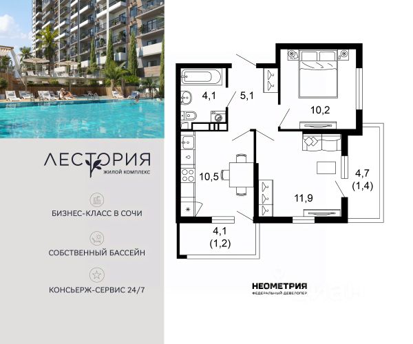Продается квартира в жилом комплексе бизнес-класса "Лестория". В составе ЖК предусмотрена собственная аквазона площадью 473 квадратных метра с двумя подогреваемыми бассейнами, что соответствуют стандартам бизнес-класса. Аквазона объединяет взрослый и детский бассейны. В welcome-zone к услугам посетителей шезлонги и все необходимые принадлежности. Раздевалки с душевыми комнатами, инфракрасная сауна — здесь все предусмотрено для комфортного отдыха и полного расслабления. Для водного комплекса продуман отдельный вход, оборудованный системой контроля и управления доступом (СКУД). Аквазона только часть уникальной инфраструктуры "Лестории", которая включает в себя также благоустроенную территорию с пятьюдесятью функциональными зонами для прогулок, отдыха и занятий спортом, видовые террасы на крышах для отдыха, работы и встреч с друзьями, а также пространство набережной Кудепсты с шезлонгами и перголами. Жилой комплекс "Лестория" состоит из шести домов высотностью от 15 до 17 этажей, окружённых зеленым массивом национального парка. На придомовой территории для жителей предусмотрены закрытые дворы с круглосуточным видеонаблюдением, активити-центр для детей и подростков, тихие зоны для отдыха и медитации. На крышах домов будут созданы зеленые террасы для наслаждения прекрасными видами на море и горы. В проекте предусмотрены разные варианты отделки квартир под потребности покупателей. Тем, кто хочет воплотить в жизнь собственные интерьерные задумки, подойдут квартиры без ремонта. Для комфортной жизни и отдыха в комплексе будет работать круглосуточный консьерж-сервис уровня 5*, который с легкостью закроет все ежедневные потребности: от заказа продуктов и встречи гостей в аэропорту до выгула и дрессировки питомца. К услугам жителей ЖК "Лестория" — собственная управляющая компания, для инвесторов предоставляются услуги доверительного управления.