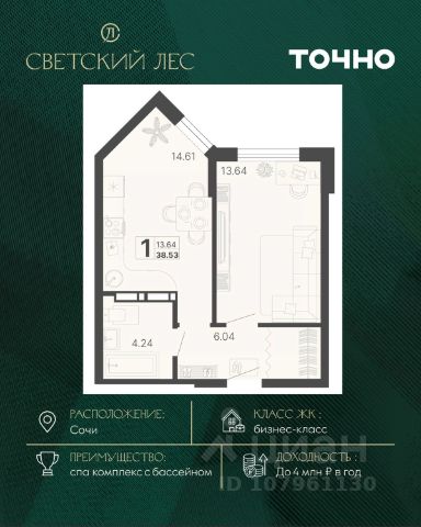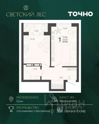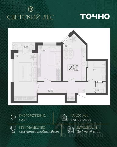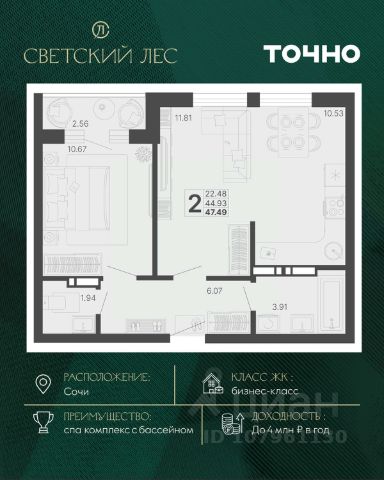 Светский лес - эксклюзивный жилой проект бизнес-класса в Сочи. Это остров цивилизации и технологий в окружении дикой природы национального парка с богатой инфраструктурой, наполненной различными сценариями премиального отдыха и жизни. Общественное пространство ЖК включает в себя прогулочные зоны, СПА комплекс с круглогодичным бассейном, детские и спортивные площадки, велодорожки, собственную набережную реки Сочи, торговую галерею с супермаркетами и ресторанами, а также инновационную школу и детский сад. Квартира на улице Краснодонская в городе Сочи.