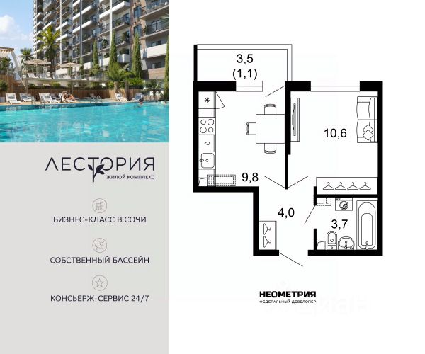Продается квартира в жилом комплексе бизнес-класса "Лестория". В составе ЖК предусмотрена собственная аквазона площадью 473 квадратных метра с двумя подогреваемыми бассейнами, что соответствуют стандартам бизнес-класса. Аквазона объединяет взрослый и детский бассейны. В welcome-zone к услугам посетителей шезлонги и все необходимые принадлежности. Раздевалки с душевыми комнатами, инфракрасная сауна — здесь все предусмотрено для комфортного отдыха и полного расслабления. Для водного комплекса продуман отдельный вход, оборудованный системой контроля и управления доступом (СКУД). Аквазона только часть уникальной инфраструктуры "Лестории", которая включает в себя также благоустроенную территорию с пятьюдесятью функциональными зонами для прогулок, отдыха и занятий спортом, видовые террасы на крышах для отдыха, работы и встреч с друзьями, а также пространство набережной Кудепсты с шезлонгами и перголами. Жилой комплекс "Лестория" состоит из шести домов высотностью от 15 до 17 этажей, окружённых зеленым массивом национального парка. На придомовой территории для жителей предусмотрены закрытые дворы с круглосуточным видеонаблюдением, активити-центр для детей и подростков, тихие зоны для отдыха и медитации. На крышах домов будут созданы зеленые террасы для наслаждения прекрасными видами на море и горы. В проекте предусмотрены разные варианты отделки квартир под потребности покупателей. Тем, кто хочет воплотить в жизнь собственные интерьерные задумки, подойдут квартиры без ремонта. Для комфортной жизни и отдыха в комплексе будет работать круглосуточный консьерж-сервис уровня 5*, который с легкостью закроет все ежедневные потребности: от заказа продуктов и встречи гостей в аэропорту до выгула и дрессировки питомца. К услугам жителей ЖК "Лестория" — собственная управляющая компания, для инвесторов предоставляются услуги доверительного управления. #ZmEtfV