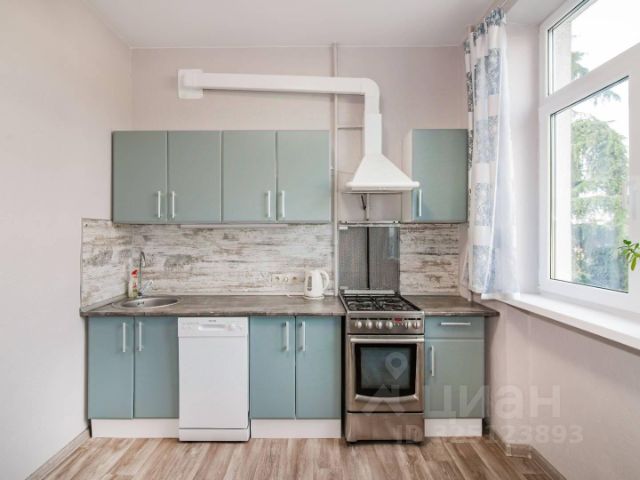 Светлая кухня с фасадами из дерева и единой столешницей. Удобная планировка с множеством шкафов для хранения. Установлена газовая плита с духовкой, вытяжка, встроенный шкаф-пенал с микроволновкой и телевизором. За холодильником — дополнительный пенал. За окном растет виноград, установлены жалюзи для приватности.