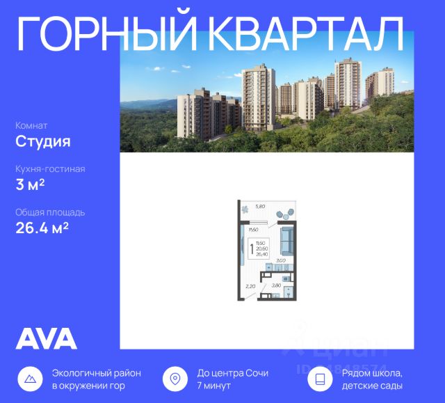 Продается студия в доме (Литер 3), срок сдачи : 3 кв. 2026, общей площадью 26.4 кв.м., на 10 этаже в новом современном жилом комплексе в Сочи "Горный квартал", Хостинский район. Отличный вариант для инвестиций и жизни. Жилой квартал из шести 16-этажных домов находится на горном склоне. Дома расположены таким образом, что из окон каждой квартиры на верхних этажах открывается прекрасная горная панорама. "Горный квартал" отличают великолепные закрытые дворы с современными детскими и спортивными площадками, беседками с навесами и гамаками, площадкой для йоги и кинотеатр под открытым небом. Вниз на лифте можно спуститься к магазинам, что займут первые этажи, поблизости находятся школы, детские сады, поликлиника и автобусные остановки. Приятный бонус к благам цивилизации - идеальная экология, великолепное звездное небо, которое видно только в горах, самый настоящий лес и чистые озёра рядом с домом. Расположение на возвышенности позволяет избежать подтоплений. Территория безопасна и защищена от неблагоприятных природных явлений. Удобная транспортная развязка позволяет быстро добраться в любую точку Сочи и Адлера. До моря всего 15 минут на автомобиле! Условия строительства и покупки Дома строятся по 214 ФЗ с использованием эскроу-счетов Способы оплаты: рассрочка, ипотека, материнский капитал Отдел продаж застройщика Отличный вариант для жизни и инвестиций! Звоните! Рады ответить на все вопросы! Студия 215.