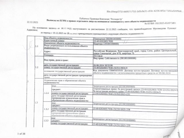 Данные получены с сайта ГИС Торги. Д-к: Магомедова Р.А. Квартира, площадь 33,5 кв.м., кадастровый номер 23:49:0202003:7030. Адрес: Краснодарский край, г. Сочи, ул. Санаторная, д. 47/6, кв. 76. Начальная цена 8 117 600 руб., задаток 8 118 руб., шаг аукциона 81 176 руб., ув. 298