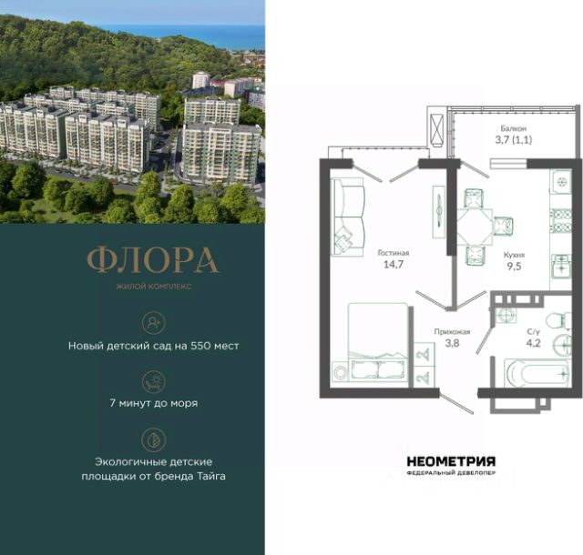 Продается квартира в ЖК "Флора" от федерального девелопера "Неометрия". Это жилой комплекс комфорт-класса в самом зеленом районе Сочи. При проектировании постарались максимально сохранить окружающую флору и фауну. Теплое море, горы, целебные источники, река, близость заповедника все это уже рядом с вами. Жилой комплекс "Флора" это: • 4,5 Га благоустроенной территории от дизайн-бюро Cora * 7 минут до моря на машине • Современные экологичные детские площадки от бренда "Тайга" • Яркие аллеи с цветниками и кустарниками для прогулок и утренних пробежек • Благоустроенная набережная с шезлонгами и перголами • Спортивные зоны для любителей пляжного волейбола, бадминтона и йоги - лапомоечные и колясочные в каждом подъезде - подземный паркинг на 429 мест Собственная управляющая компания с функцией "доверительного управления" Кудепста это прекрасный зеленый оазис, который расположился между историческим центром Сочи и Адлером. Благодаря выгодному местоположению ЖК "Флора" между курортным Адлером и центром Сочи до самых популярных социальных, культурных и развлекательных объектов города можно добраться за считанные минуты: Олимпийский парк. Красная Поляна, аэропорт, жд-вокзал. Кроме того, в шаговой доступности расположена вся необходимая социальная инфраструктура, что удобно для жизни всех членов семьи: • 2 школы; • 3 детских сада; • 3 поликлиники; • 2 фитнес-центра; • 3 магазина и гипермаркета; • спортивная школа • 2 остановки общественного транспорта. На первых этажах комплекса расположены коммерческие помещения пункты выдачи маркетплейсов, кофейни, магазины. В жилом комплексе соблюден принцип сбалансированных и эргономичных планировочных решений: от компактных студий до просторных семейных квартир. В каждой квартире есть балкон, и установлены увеличенные оконные рамы. На 12 этаже повышенной комфортности открываются потрясающие виды на море и национальный парк благодаря панорамному остеклению лоджий. Квартиру можно купить с черновой отделкой или с готовым ремонтом "Прайм", а также с сертификатом на покупку мебели. Приобрести квартиру можно за наличную оплату, в ипотеку, с привлечением средства маткапитала. #Z7OA62
