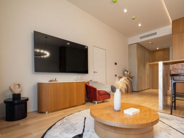 Двухкомнатная резиденция с кухней-гостиной и балконом, а также одним санузлом. Из окон открывается вид во внутренний двор, на бассейны, парки. Высота потолков составляет 3,1 метра. Отделка под ключ