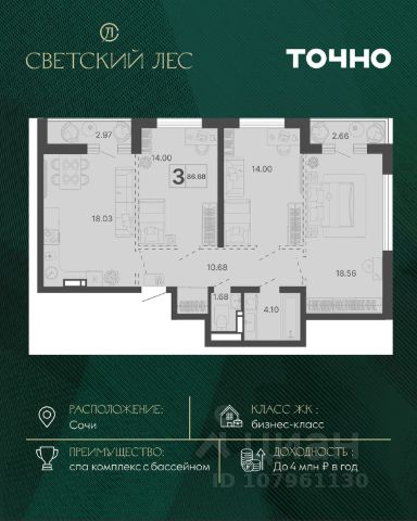 В продаже 2-комнатная квартира площадью 60, расположенная Литер 6 жилого комплекса комфорт+ класса "Горный квартал". Комплекс от девелопера AVA находится в Сочи, Хостинского района, в 15 минутах езды от центра города.
