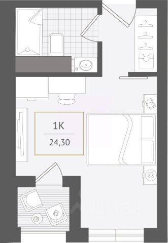 Резиденция с балконом, а также одним санузлом. Из окон открывается вид во внешний двор, на образовательный центр Сириус. Высота потолков составляет 3,1 метра. Отделка под ключ