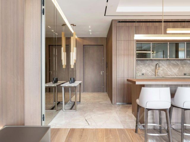 Прихожая: Просторная, с местом для гардеробной . Гостиная-кухня Смежная (проходная) комната. Объединяет зону отдыха с диваном и ТВ, обеденную группу и современную кухню Через это помещение осуществляется проход в спальню. Спальня Изолированная комната. Вмещает большую кровать, гардеробную зону и место для отдыха. Огромное светлое общее пространство, изолированная спальня, много места для хранения.