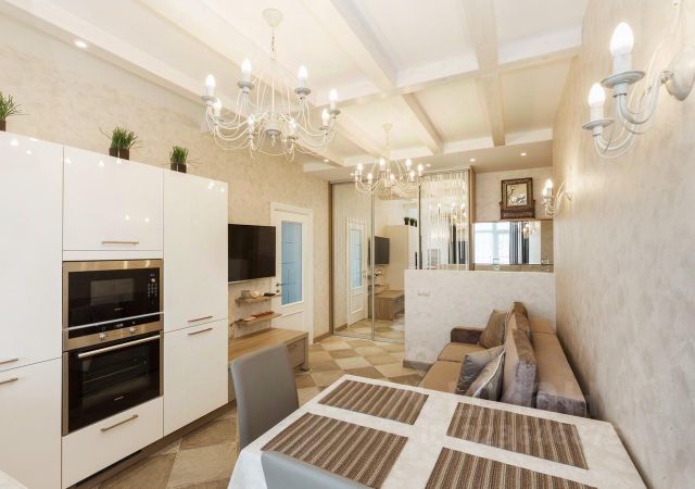 - гостиная объединяет в себе зону отдыха и столовую, где мягкий диван из Европы и стильные барные стулья приглашают расслабиться, а просторный обеденный стол станет местом для дружеских встреч и семейных ужинов. На Итальянской кухне установлены современные устройства, которые делают процесс готовки приятным и комфортным, а именно техника bosch: духовой шкаф, СВЧ печь, посудомоечная машина, индукционная варочная плита, а так же капсульная кофемашина и декантер для вина;