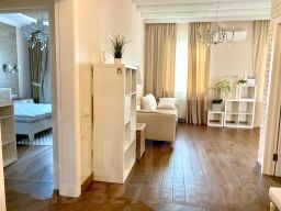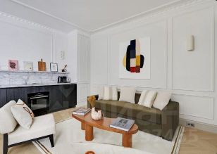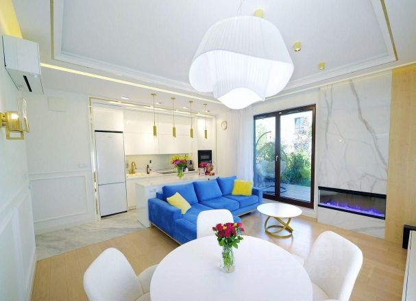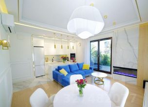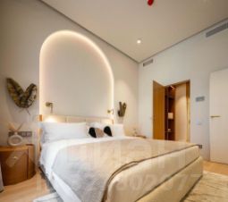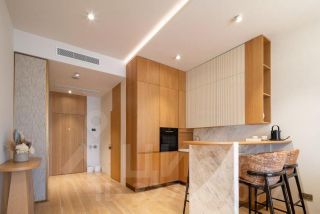 Двухкомнатная резиденция с кухней-гостиной и балконом, а также одним санузлом. Из окон открывается вид во внутренний двор, на бассейны, парки. Высота потолков составляет 3,1 метра. Отделка под ключ