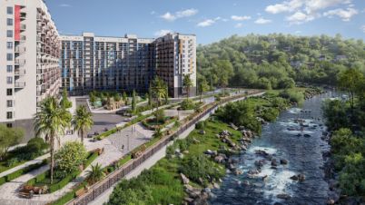 Рядом река и обустроенная набережная с малыми формами для прогулок и игр с детьми.