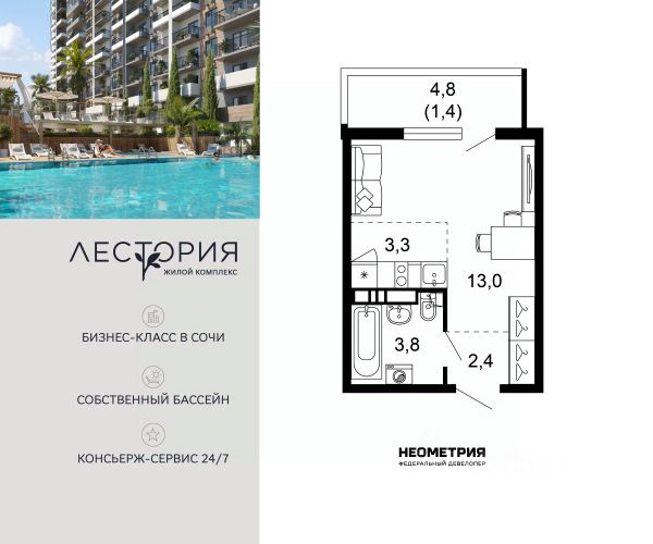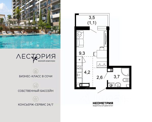 Продается квартира в жилом комплексе бизнес-класса "Лестория". В составе ЖК предусмотрена собственная аквазона площадью 473 квадратных метра с двумя подогреваемыми бассейнами, что соответствуют стандартам бизнес-класса. Аквазона объединяет взрослый и детский бассейны. В welcome-zone к услугам посетителей шезлонги и все необходимые принадлежности. Раздевалки с душевыми комнатами, инфракрасная сауна — здесь все предусмотрено для комфортного отдыха и полного расслабления. Для водного комплекса продуман отдельный вход, оборудованный системой контроля и управления доступом (СКУД). Аквазона только часть уникальной инфраструктуры "Лестории", которая включает в себя также благоустроенную территорию с пятьюдесятью функциональными зонами для прогулок, отдыха и занятий спортом, видовые террасы на крышах для отдыха, работы и встреч с друзьями, а также пространство набережной Кудепсты с шезлонгами и перголами. Жилой комплекс "Лестория" состоит из шести домов высотностью от 15 до 17 этажей, окружённых зеленым массивом национального парка. На придомовой территории для жителей предусмотрены закрытые дворы с круглосуточным видеонаблюдением, активити-центр для детей и подростков, тихие зоны для отдыха и медитации. На крышах домов будут созданы зеленые террасы для наслаждения прекрасными видами на море и горы. В проекте предусмотрены разные варианты отделки квартир под потребности покупателей. Тем, кто хочет воплотить в жизнь собственные интерьерные задумки, подойдут квартиры без ремонта. Для комфортной жизни и отдыха в комплексе будет работать круглосуточный консьерж-сервис уровня 5*, который с легкостью закроет все ежедневные потребности: от заказа продуктов и встречи гостей в аэропорту до выгула и дрессировки питомца. К услугам жителей ЖК "Лестория" — собственная управляющая компания, для инвесторов предоставляются услуги доверительного управления. #27oF27