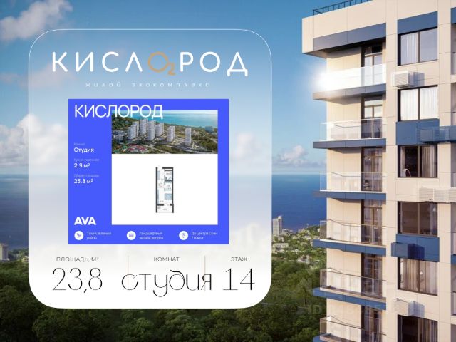 В продаже студия, площадью 23.15, расположенная Литер 3 жилого комплекса бизнес-класса "Кислород". Комплекс от девелопера AVA находится в Сочи, на северном склоне горы Бытха, в 7 минутах езды от центра города. Отличная транспортная доступность Остановка автобусов и маршрутных такси - 6 минут пешком, Курортный проспект и пляжи - 10 минут на авто, Эко-парк "Быхта" и туристические тропы - 5 минут пешком, Школы, детские сады, поликлиники, супермаркеты - 5-10 минут на авто, Ж/Д вокзал и центр города - 15 минут на транспорте, Аэропорт - 30 минут на авто. Аккуратный облик домов Жилой комплекс состоит из 15 корпусов высотой 19 этажей. Светлые фасады с голубыми акцентами и архитектурной подсветкой лучше отражают солнце и визуально не перегружают застройку. Благодаря расположению на склоне, из квартир открываются широкие панорамы, в том числе на море и эко-парк. Безопасный двор В комплексе благоустроенная территория организована как безопасное и многофункциональное пространство, где найдется место каждому. Дворы закрыты от автомобилей и прохожих, поэтому здесь тихо и безопасно для детей. На территории предусмотрены игровые площадки для детей разных возрастов, спортивное поле для футбола и баскетбола, а также уличные тренажеры - заниматься спортом можно рядом с домом, без поездок в фитнес-клуб. Для спокойного отдыха предусмотрены зоны со скамейками и прогулочные дорожки по всей территории комплекса. Собственный парк В 5 минутах ходьбы от домов будет благоустроен экологический парк "Бытха" с прогулочными, спортивными, образовательными и экстремальными маршрутами, а также детскими и спортивными площадками. Там можно интересно проводить время с детьми и друзьями, выходить на пробежку или тренировку, гулять и заниматься с питомцем. Преимущества Квартиры европланировок с двумя балконами, гардеробными и видами на несколько сторон света, Подземная, многоуровневая и наземная парковки для автомобилей жителей и гостей, Комфортно не только отдыхать, но и полноценно жить всей семьей: детские сады и школы в 5 минутах, удобная дорогая до города, магазины и сервисы поблизости.