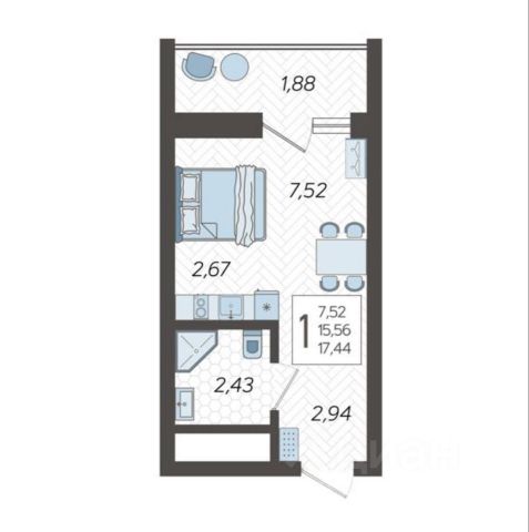 Общая площадь квартиры составляет 17,09 кв. м, жилая — 7,7 кв. м, кухня — 2,85 кв. м. Высота потолков — 2,72 м . Квартира находится на 6 этаже 19-этажного панельного дома.