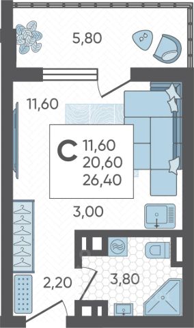 Площадь 15,3 кв.м, + 4 кв.м бaлкoн.