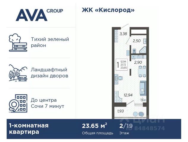 В продаже студия, площадью 24.5, расположенная Литер 2 жилого комплекса бизнес-класса "Кислород". Комплекс от девелопера AVA находится в Сочи, на северном склоне горы Бытха, в 7 минутах езды от центра города.