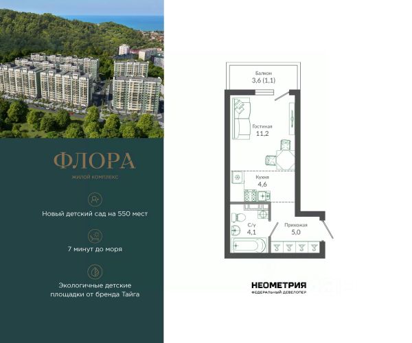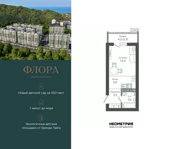Продается квартира в ЖК "Флора" от федерального девелопера "Неометрия". Это жилой комплекс комфорт-класса в самом зеленом районе Сочи. При проектировании постарались максимально сохранить окружающую флору и фауну. Теплое море, горы, целебные источники, река, близость заповедника все это уже рядом с вами.