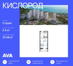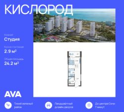 В продаже студия, площадью 20.67, расположенная Литер 3 жилого комплекса бизнес-класса "Кислород". Комплекс от девелопера AVA находится в Сочи, на северном склоне горы Бытха, в 7 минутах езды от центра города.