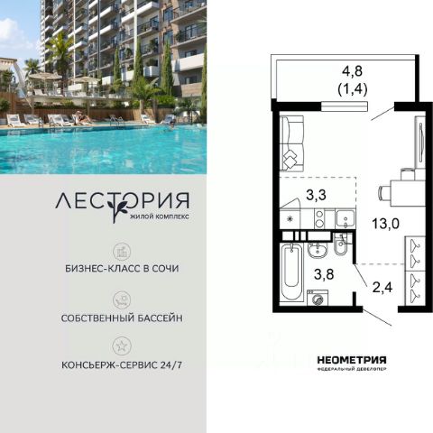 Продается квартира в жилом комплексе бизнес-класса "Лестория". В составе ЖК предусмотрена собственная аквазона площадью 473 квадратных метра с двумя подогреваемыми бассейнами, что соответствуют стандартам бизнес-класса. Аквазона объединяет взрослый и детский бассейны. В welcome-zone к услугам посетителей шезлонги и все необходимые принадлежности. Раздевалки с душевыми комнатами, инфракрасная сауна — здесь все предусмотрено для комфортного отдыха и полного расслабления. Для водного комплекса продуман отдельный вход, оборудованный системой контроля и управления доступом (СКУД). Аквазона только часть уникальной инфраструктуры "Лестории", которая включает в себя также благоустроенную территорию с пятьюдесятью функциональными зонами для прогулок, отдыха и занятий спортом, видовые террасы на крышах для отдыха, работы и встреч с друзьями, а также пространство набережной Кудепсты с шезлонгами и перголами. Жилой комплекс "Лестория" состоит из шести домов высотностью от 15 до 17 этажей, окружённых зеленым массивом национального парка. На придомовой территории для жителей предусмотрены закрытые дворы с круглосуточным видеонаблюдением, активити-центр для детей и подростков, тихие зоны для отдыха и медитации. На крышах домов будут созданы зеленые террасы для наслаждения прекрасными видами на море и горы. В проекте предусмотрены разные варианты отделки квартир под потребности покупателей. Тем, кто хочет воплотить в жизнь собственные интерьерные задумки, подойдут квартиры без ремонта. Для комфортной жизни и отдыха в комплексе будет работать круглосуточный консьерж-сервис уровня 5*, который с легкостью закроет все ежедневные потребности: от заказа продуктов и встречи гостей в аэропорту до выгула и дрессировки питомца. К услугам жителей ЖК "Лестория" — собственная управляющая компания, для инвесторов предоставляются услуги доверительного управления. Купить квартиру-студию от застройщика в районе Адлерский в городе Сочи.