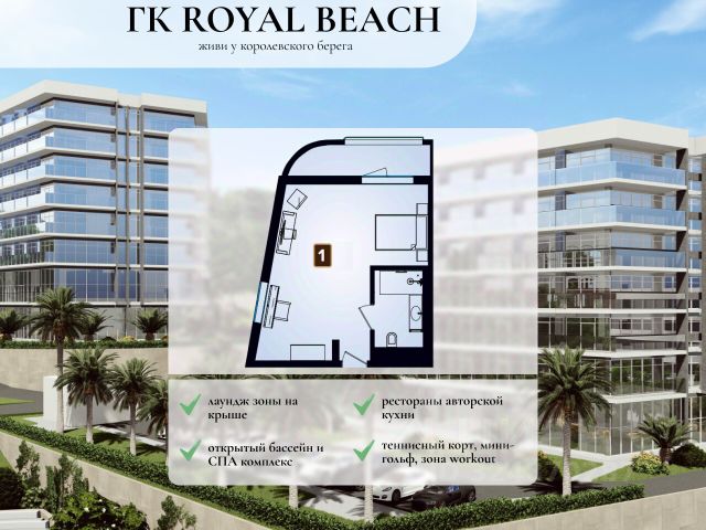 ROYAL BEACH SOCHI для жизни или инвестиций. В комплексе доступны резиденции для постоянного проживания или номера в отеле 5* под управлением международного оператора, площадью от 52 до 148 кв метров. ROYAL BEACH SOCHI расположен на впечатляющей территории 10 Гектаров, где имеется вся необходимая инфраструктура. Для отдыха: Масштабная SPA-зоны Лаунж-зоны на крыше Каток Музей винного дела Компьютерный клуб Концертный театр Кинотеатр Рестораны авторской кухни Кафе и кондитерские Музей арт-обьектов Залы для боулинга Бильярдные Спорт и оздоровление: Теннисные корты Поля для мини-гольфа Work out площадка Терренкур Открытый бассейн Спорткомплекс Медицинский центр Для детей: Веревочный парк Батутный комплекс Тематический парк Игровые зоны Детский центр для проведения мастер-классов Деловая среда: Коворкинг-зона Выставочный конгресс - центр Конгресс-холл для совещаний