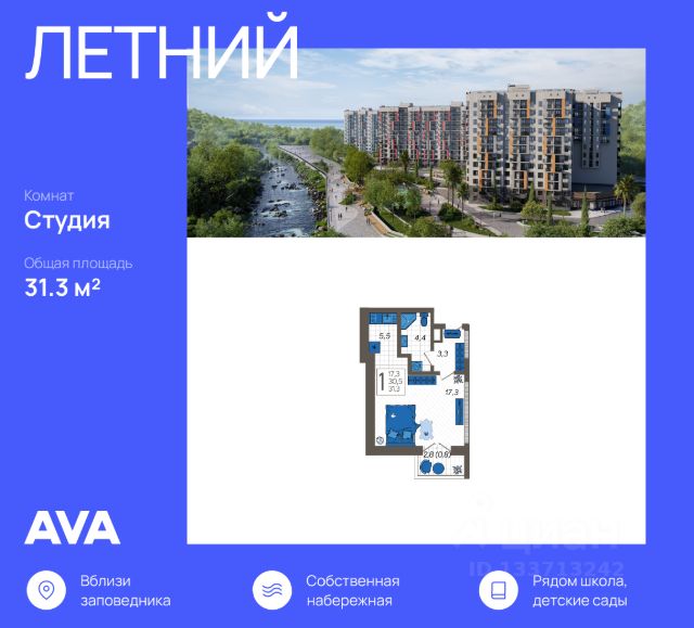 Продается студия в доме (Литер 4), Преимущества квартиры: совмещённый санузел, балкон, smart квартира, срок сдачи : 2 кв. 2024, общей площадью 22.9 кв.м., на 1 этаже. Без отделки, но с возможностью заказать отделку Жилой комплекс "Летний" расположен в ущелье реки Кудепста. В пешей минутной доступности детские сады и школы. Удобный выезд к железнодорожному вокзалу и аэропорту. За 15 минут можно доехать до Олимпийского парка. ЖК Летний - это комплексная застройка из семи 12-этажных домов, который находится в долине реки Кудепста, с собственной набережной, видом из окон на море и горы, многоуровневым паркингом с эксплуатируемой кровлей, современными детскими и спортивными площадками. Рядом расположен заповедник, где берут начало туристические тропы на самые красивые водопады региона, единственная в России тисо-самшитовая роща. • 5 минут на машине до моря • 10 минут до центра Сочи • 10 минут до центра Адлера • 15 минут пешком до школы • 5 минут пешком Пятерочка в пешей доступности магазины и точки бытового обслуживания • 10 минут пешком до конного клуба Верхом по Сочи, где начинаются прогулочные маршруты по достопримечательностям долины реки Кудепста на лошадях или пешком • Варианты оплаты: рассрочка, стандартная ипотека, военная ипотека, ипотека без первоначального взноса, материнский капитал Торопитесь купить квартиру по выгодной цене на стадии строительства! Помните, что с каждым возведенным этажом увеличивается цена квартиры! #ZSvaZo