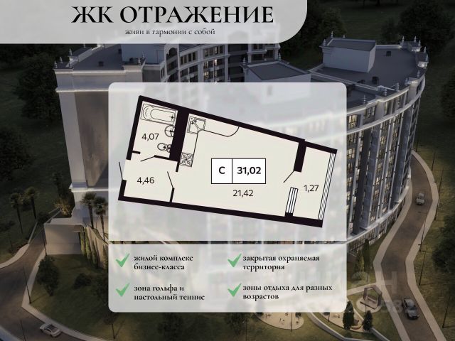 ЖК Отражение - это настоящий бизнес-класс в самом сердце города. Идеальный баланс трех ценностей: комфорта, безопасности и качества для гармоничной и спокойной жизни. Самое важное в шаговой доступности - поликлиники, сад, школа, кинотеатр, православный храм, огромное количество магазинов и аптек, отделение банка, салоны красоты, почта. Объект расположен внутри сложившегося микрорайона со всем необходимым. Донская респектабельный район, который сегодня переживает новый расцвет и обновляется. Насыщенная инфраструктура района становится только лучше и разнообразнее. Не вы подстраиваетесь под структуру, а она под вас - здесь времени хватит на все. С помощью развитой внутренней инфраструктуры создаётся пространство больших возможностей, самые необходимые товары и услуги - на расстоянии минутной поездки на лифте. В домах предусмотрена подземная парковка и зарядная станция для электрокаров. Закрытая охраняемая территория; вход в подъезд по Face-id; зона для работы и переговоров; зал для йоги и фитнеса; зона гольфа и настольный теннис; шахматный стол и мини-хоккей; амфитеатр, который в вечернее время будет функционировать как кинотеатр на свежем воздухе; территория с зонами для отдыха и детской игровой площадкой.