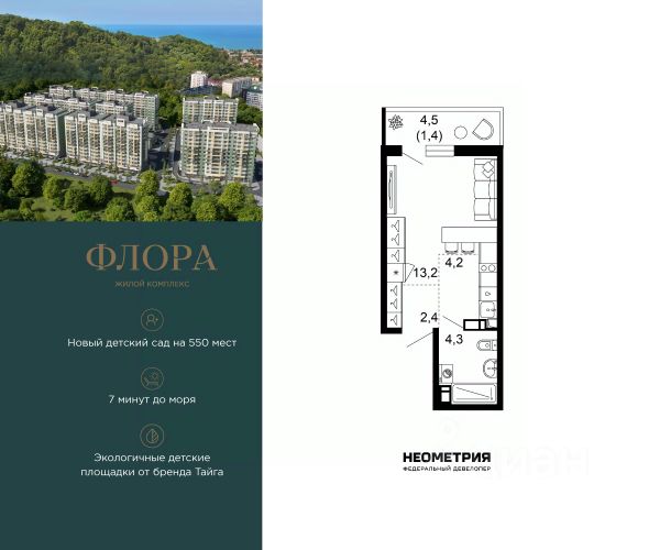 Продается квартира в ЖК "Флора" от федерального девелопера "Неометрия". Это жилой комплекс комфорт-класса в самом зеленом районе Сочи. При проектировании постарались максимально сохранить окружающую флору и фауну. Теплое море, горы, целебные источники, река, близость заповедника все это уже рядом с вами. Жилой комплекс "Флора" это: • 4,5 Га благоустроенной территории от дизайн-бюро Cora * 7 минут до моря на машине • Современные экологичные детские площадки от бренда "Тайга" • Яркие аллеи с цветниками и кустарниками для прогулок и утренних пробежек • Благоустроенная набережная с шезлонгами и перголами • Спортивные зоны для любителей пляжного волейбола, бадминтона и йоги - лапомоечные и колясочные в каждом подъезде - подземный паркинг на 429 мест Собственная управляющая компания с функцией "доверительного управления" Кудепста это прекрасный зеленый оазис, который расположился между историческим центром Сочи и Адлером. Благодаря выгодному местоположению ЖК "Флора" между курортным Адлером и центром Сочи до самых популярных социальных, культурных и развлекательных объектов города можно добраться за считанные минуты: Олимпийский парк. Красная Поляна, аэропорт, жд-вокзал. Кроме того, в шаговой доступности расположена вся необходимая социальная инфраструктура, что удобно для жизни всех членов семьи: • 2 школы; • 3 детских сада; • 3 поликлиники; • 2 фитнес-центра; • 3 магазина и гипермаркета; • спортивная школа • 2 остановки общественного транспорта. На первых этажах комплекса расположены коммерческие помещения пункты выдачи маркетплейсов, кофейни, магазины. В жилом комплексе соблюден принцип сбалансированных и эргономичных планировочных решений: от компактных студий до просторных семейных квартир. В каждой квартире есть балкон, и установлены увеличенные оконные рамы. На 12 этаже повышенной комфортности открываются потрясающие виды на море и национальный парк благодаря панорамному остеклению лоджий. Квартиру можно купить с черновой отделкой или с готовым ремонтом "Прайм", а также с сертификатом на покупку мебели. Приобрести квартиру можно за наличную оплату, в ипотеку, с привлечением средства маткапитала.