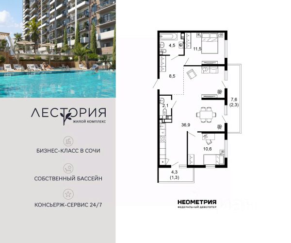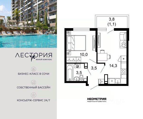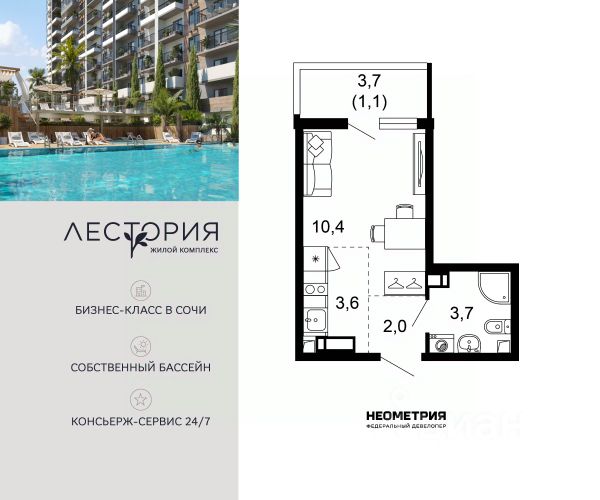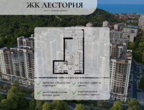 Продается квартира в жилом комплексе бизнес-класса "Лестория". В составе ЖК предусмотрена собственная аквазона площадью 473 квадратных метра с двумя подогреваемыми бассейнами, что соответствуют стандартам бизнес-класса. Аквазона объединяет взрослый и детский бассейны. В welcome-zone к услугам посетителей шезлонги и все необходимые принадлежности. Раздевалки с душевыми комнатами, инфракрасная сауна — здесь все предусмотрено для комфортного отдыха и полного расслабления. Для водного комплекса продуман отдельный вход, оборудованный системой контроля и управления доступом (СКУД). Аквазона только часть уникальной инфраструктуры "Лестории", которая включает в себя также благоустроенную территорию с пятьюдесятью функциональными зонами для прогулок, отдыха и занятий спортом, видовые террасы на крышах для отдыха, работы и встреч с друзьями, а также пространство набережной Кудепсты с шезлонгами и перголами. Жилой комплекс "Лестория" состоит из шести домов высотностью от 15 до 17 этажей, окружённых зеленым массивом национального парка. На придомовой территории для жителей предусмотрены закрытые дворы с круглосуточным видеонаблюдением, активити-центр для детей и подростков, тихие зоны для отдыха и медитации. На крышах домов будут созданы зеленые террасы для наслаждения прекрасными видами на море и горы. В проекте предусмотрены разные варианты отделки квартир под потребности покупателей. Тем, кто хочет воплотить в жизнь собственные интерьерные задумки, подойдут квартиры без ремонта. Для комфортной жизни и отдыха в комплексе будет работать круглосуточный консьерж-сервис уровня 5*, который с легкостью закроет все ежедневные потребности: от заказа продуктов и встречи гостей в аэропорту до выгула и дрессировки питомца. К услугам жителей ЖК "Лестория" — собственная управляющая компания, для инвесторов предоставляются услуги доверительного управления.