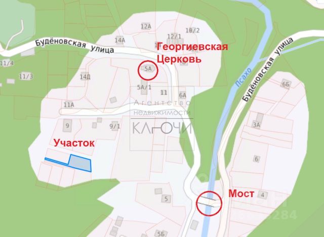 Через дорогу от участка горная река Псахо. Рядом красивое место для купания куда летом приезжают отдыхать все знающие местные. Детская площадка. Ровное место!