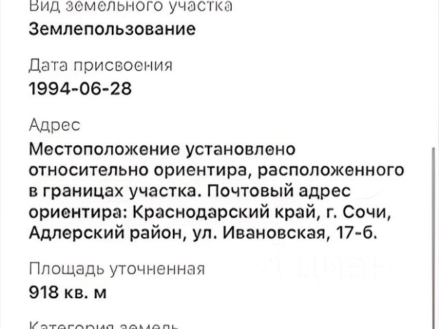 Продается земельный участок в Адлерском районе, в 10 минутах от моря на транспорте. Участок почти ровный, с плодовыми ,фруктовыми деревьями. Так же растения с ягодами. На территории участка скважина . Есть возможность приобрести соседние участки. До Красной Поляны 30 мин на транспорте. До жд вокзала Адлер и Олимпийский парк 10 мин на транспорте. До центрального Сочи (морской порт) 25 мин на транспорте. С документами все в норме. _Риелторов прошу не беспокоить_ Собственник Со 100 процентной гарантией что документы все в порядке. Звоните расскажу более подробно Загородная недвижимость на улице Ивановская в селе Высокое.