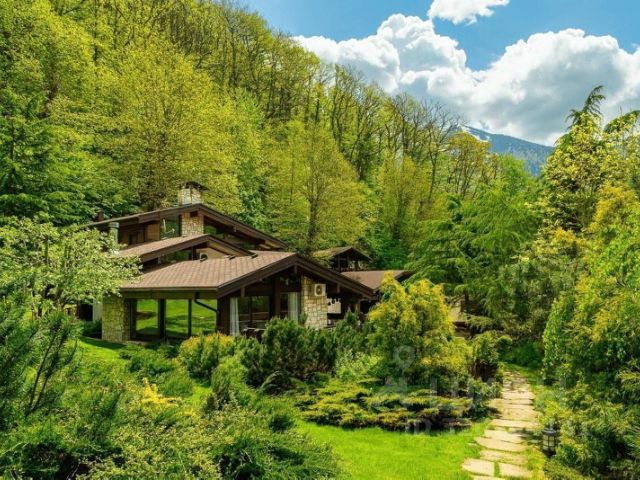 Лестница на второй этаж из дуба с подсветкой. Поднявшись на второй этаж мы попадаем в просторную гостиную, в обеденной зоне расположен стол из массива кедра, далее в каминной зоне величественно стоит английская кожаная мебель удобные кресла и диван, далее кухонная зона со встроенной техникой , водопровод из горной реки Мзымта, раковина на против окна откуда открывается вид на зеленую гору, высокий барный стол из массива и стулья с металическим основанием разделяют зоны гостиной и кухни. Из гостиной можно выйти на мансарду 100м2 откуда открывается невероятный вид горные пейзажи. На втором этаже три спальни, каждая со своим санузлом, все кровати из массива кавказского дуба, спать на такой кровати особое удовольствие.