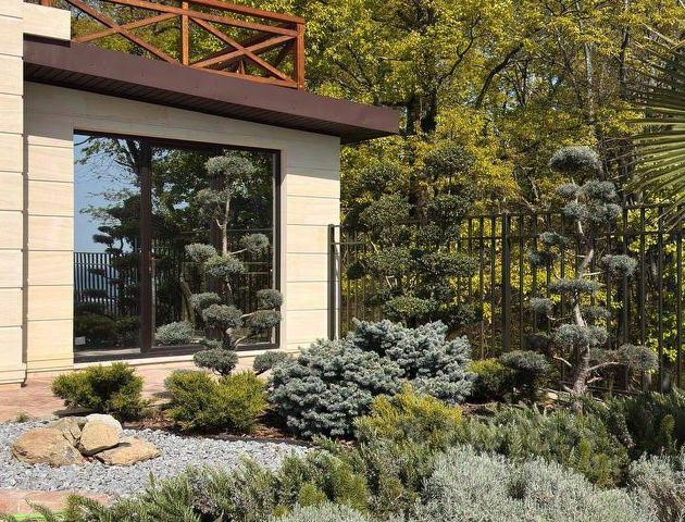На участке: газон, пешеходные дорожки, освещение, ландшафтное озеленение.