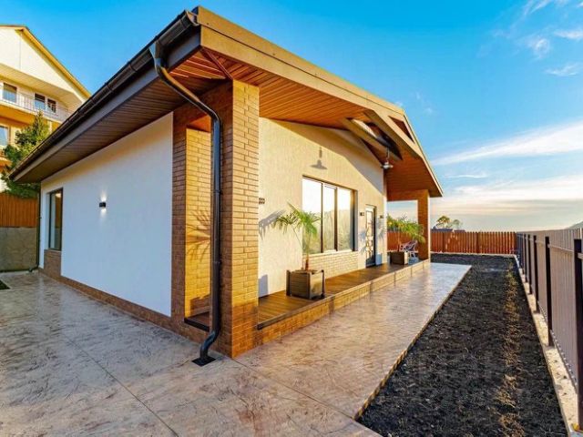 1 этаж: летняя кухня, из которой вход в основную часть дома, а также в банный комплекс; баня с комнатой отдыха, с/у, душевой и выходом к бассейну. Основная часть дома: студия с 5-метровыми потолками и панорамой моря, с/у, подсобное помещение (прачечная)