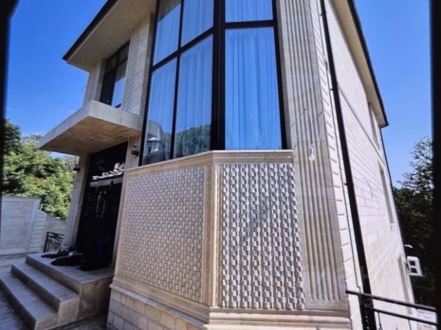 Фасад здания дополнительно утеплён снаружи плитами Технониколь, оштукатурены "короедом" и облицованы фотокерамическими панелями под натуральное дерево светло-коричневого цвета. Создан эффект, т.н. термоса: летом в доме прохладно, а зимой тепло. Окна большие, панорамные в алюминиевом профиле с защитным анодированным покрытием от ультрафиолетовых лучей и радиации - комнаты несильно будут нагреваться в солнечную погоду, которая в Сочи длится более 300 дней в году.