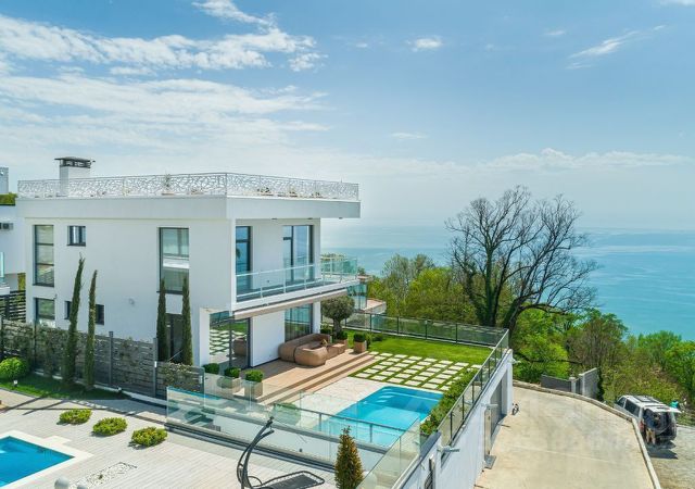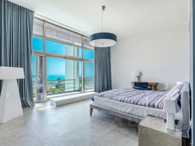 Современная архитектура дома с изящным наполнением и грамотной планировкой. Великолепное архитектурное решение исполнено в самых лучших традициях хай-тека, который характеризуется строгой геометрией фасадных линий, большой площадью витражного остекления. Прекрасным дополнением к архитектуре служит красивый ландшафтный дизайн прилегающей к дому территории. Участок украшен пальмами, рододендронами, олеандрами.