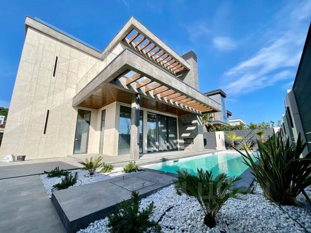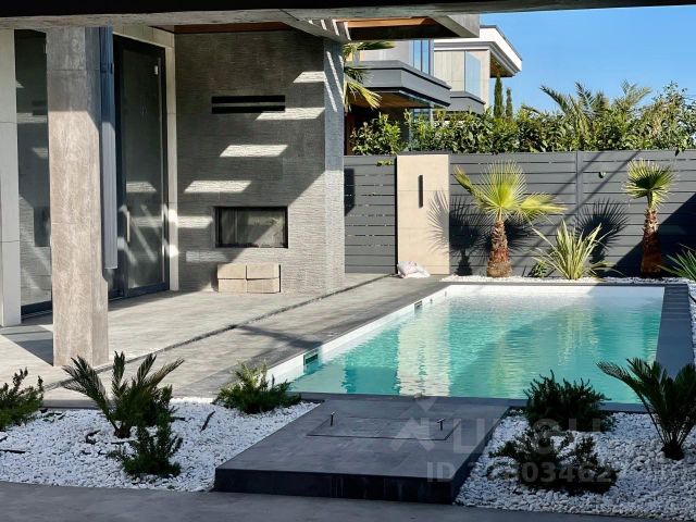 Участок включает площадку для нескольких машин, террасу для отдыха, барбекю, душевую, есть открытый переливной бассейн "Инфинити". По всей территории выполнено озеленение с автоматическим поливом, ночная подсветка клумб и фасада.