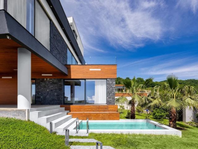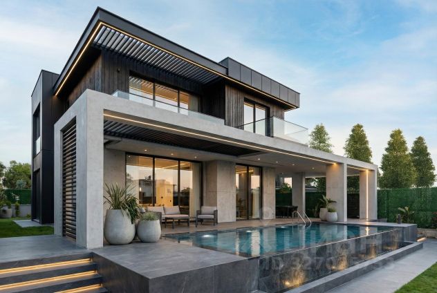 Качество и стиль: Премиальная отделка, панорамное остекление, современный бассейн, возможность интеграции системы умный дом.