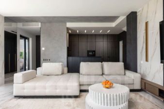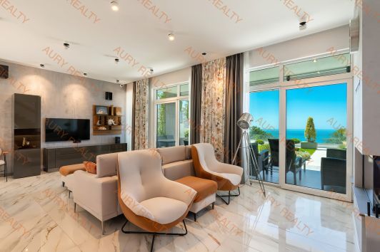 Просторная гостиная, объединенная с кухней-столовой, с панорамным остеклением и выходом на террасу с видом на море и Олимпийский парк.