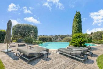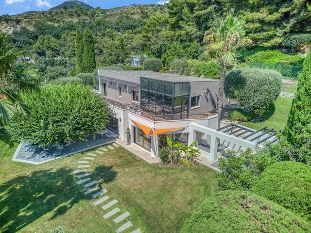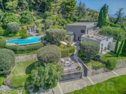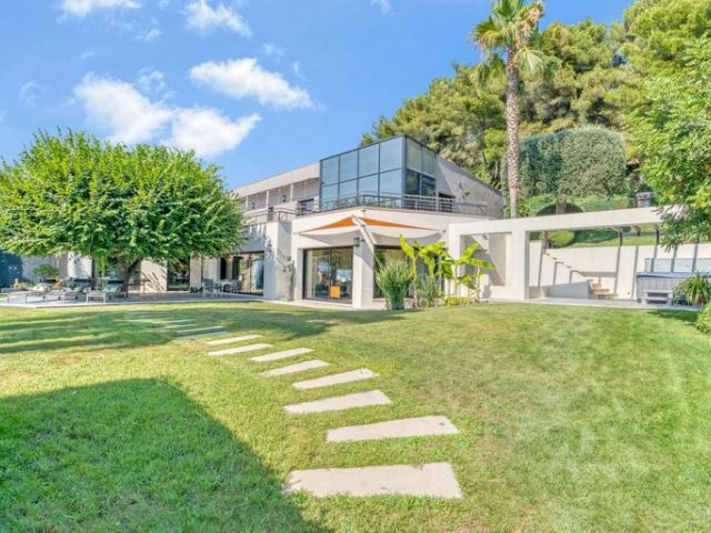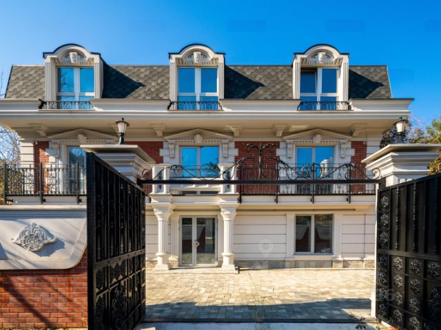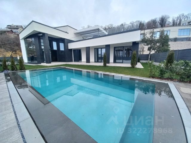 Участок включает площадку для нескольких машин, террасу для отдыха, барбекю, душевую, есть открытый переливной бассейн "Инфинити". По всей территории выполнено озеленение с автоматическим поливом, ночная подсветка клумб и фасада.