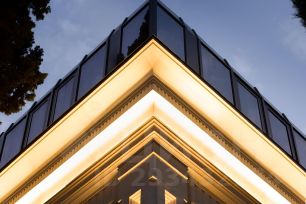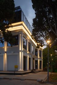 - С наступлением сумерек включается теплая подсветка фасада, а вокруг особняка расположена зеленая зона.