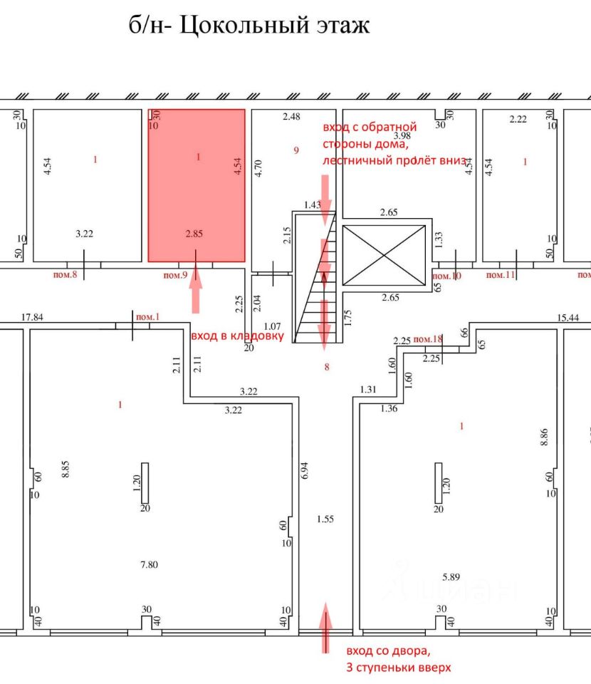 Функционально лучшая кладовая в комплексе. Транзитных коммуникаций нет, за стеной находится ТП (риск пострадать при авариях снижен, т.к. это помещение будут спасать первым), расположение ближайшее от входа, удобно вносить длинномеры.