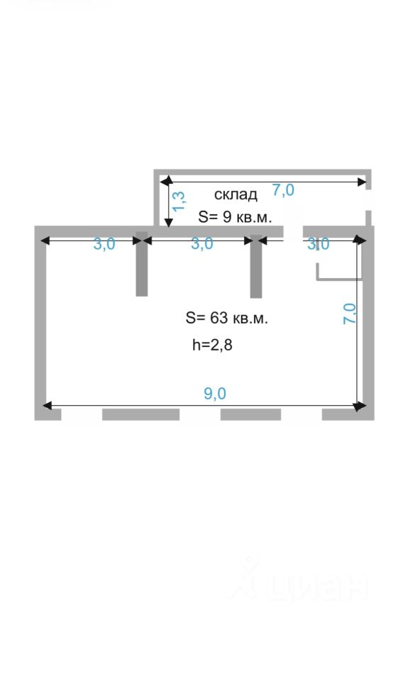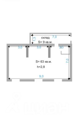Площадь: 63 кв. м. основного помещения + отдельное складское помещение 9 кв. м.