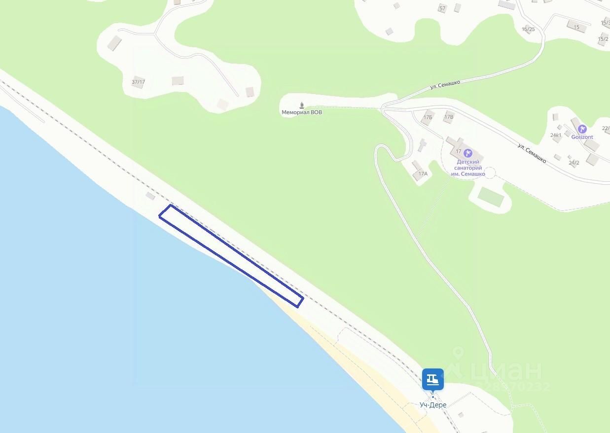 Земельный участок расположен в курортной зоне Черноморского побережья на пляже микрорайона Уч-Дере в окружении жилой застройки. Развитая инфраструктура. Хороший пешеходный трафик. В шаговой доступности магазины, остановка общественного транспорта и железнодорожная станция Уч-Дере. Наличие парковочных мест на прилегающей территории.